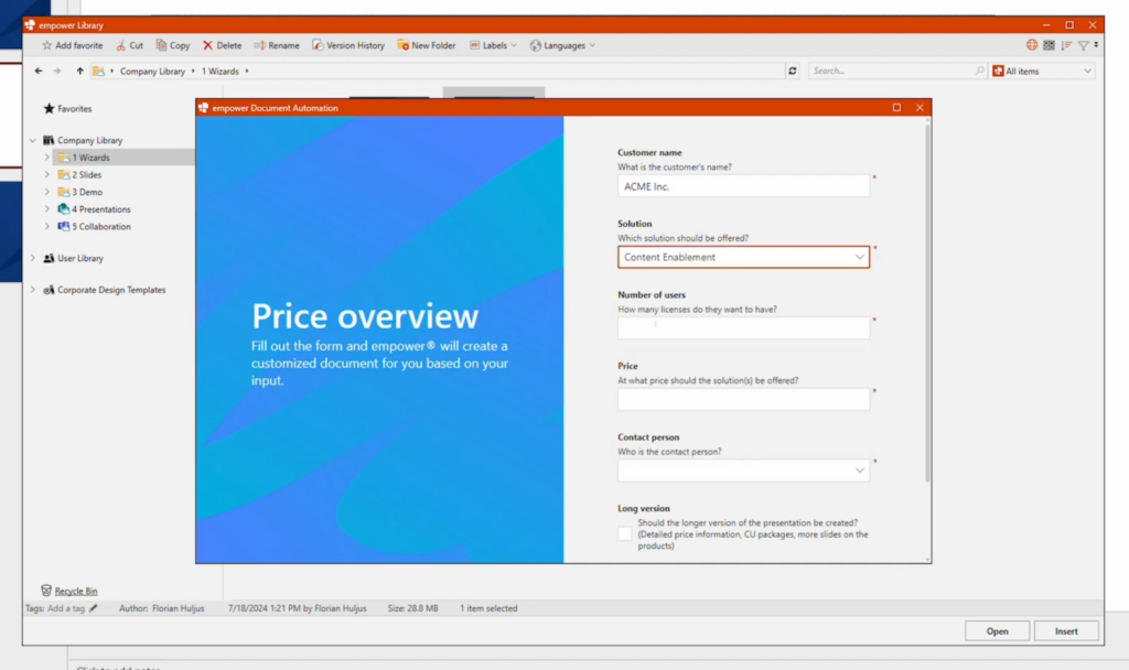With empower® Document Automation, you can generate pitch decks, contracts, proposals, or strategy slides at the click of a button – accurate, consistent, and fully on-brand.
